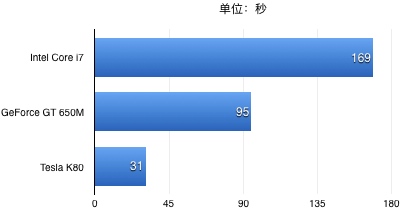 为了对MacBook上GPU的计算性能有进一步的了解,我对比了这块GPU(GeForce GT 650M)和同一台电脑上的CPU(Intel Core i7)以及AWS上p2.xlarge实例的Tesla K80显卡在MNIST数据集上训练一个CNN模型所消耗的时间(one epoch):